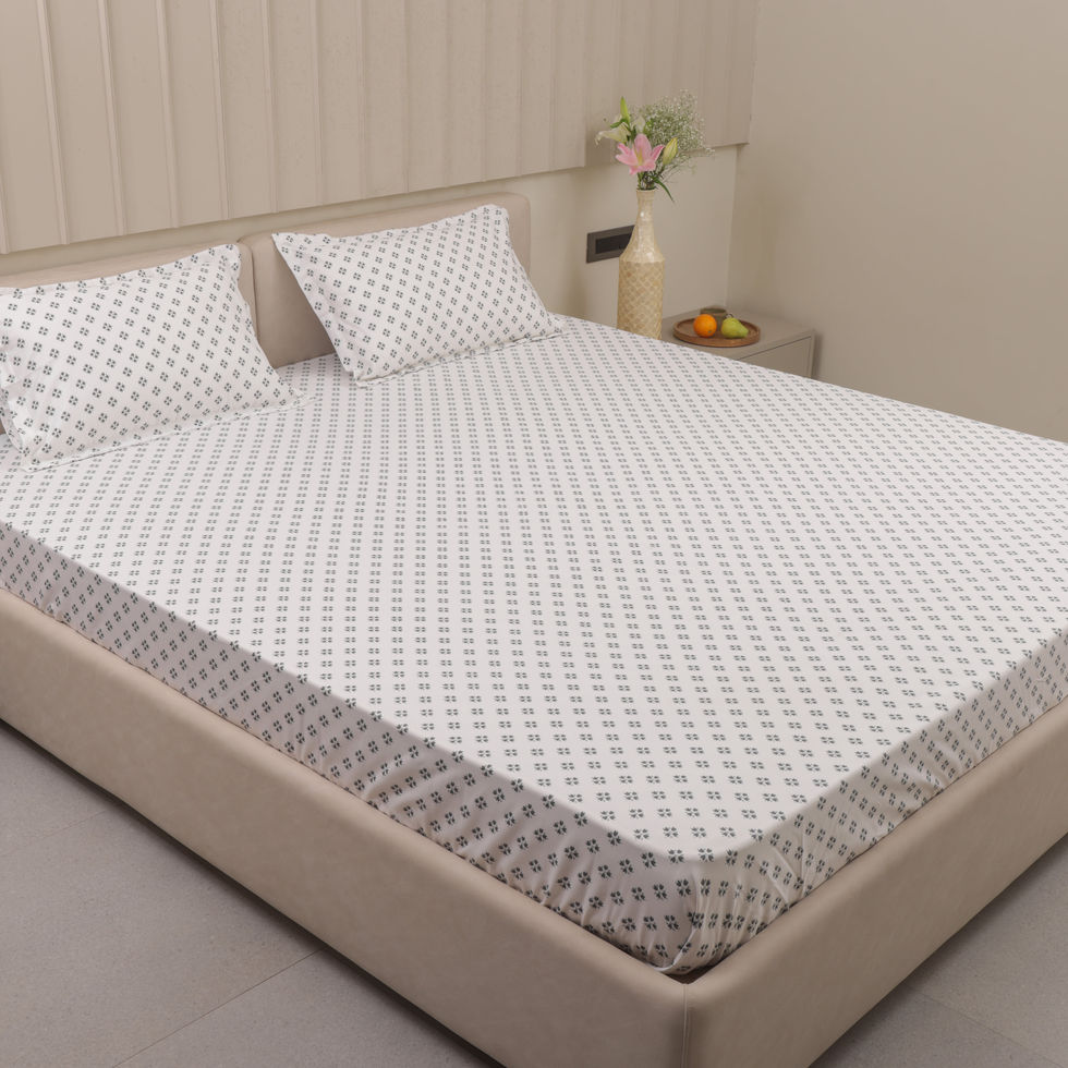 Bring balance to your bedroom with Vishram Sthira Rekha Bedsheet, defined by a soft, rhythmic micro-motif arranged with quiet precision across a warm off-white base. The design is understated and steady—neither decorative nor loud—making it ideal for spaces that value restraint and harmony.